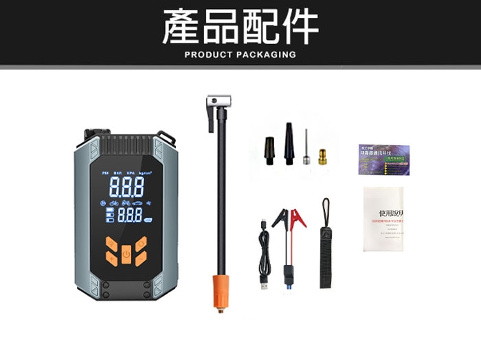 商品內容:主體x1/電瓶夾x1/充氣嘴x4/充氣管x1/充電線x1/掛繩x1/說明書x1/保固卡x1