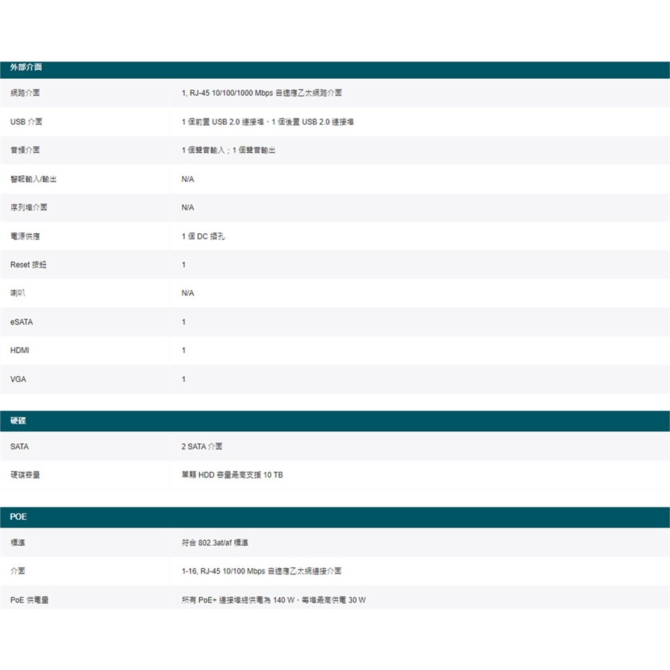 -140 W PoE 供電: 16個 802.3af/at 標準的 PoE+ 連接埠,提供 140W 電力供應。