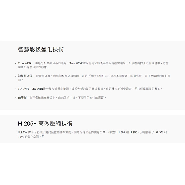 -H.25+: 攝影機可以傳輸壓縮過的超清晰影像,不佔用額外頻寬並節省硬碟空間,減輕-網路負載,在減少監控成本的同時不犧牲影響品質。
