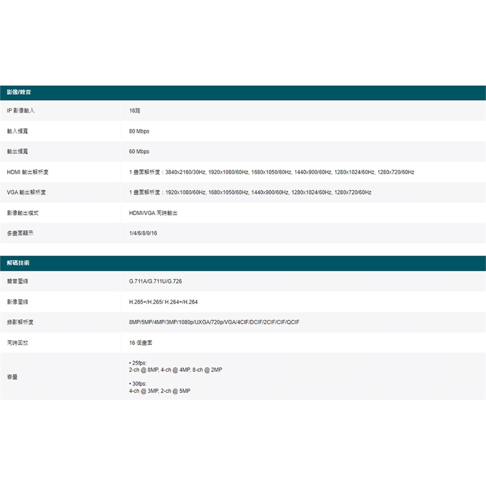 -4K HDMI 影像輸出及16MP 解碼能力: 提供高達 8 MP 更清晰的影像解析度,以及 8 路 2 MP的解碼能力,讓您可以同時享用更多頻道的即時畫面及回放。