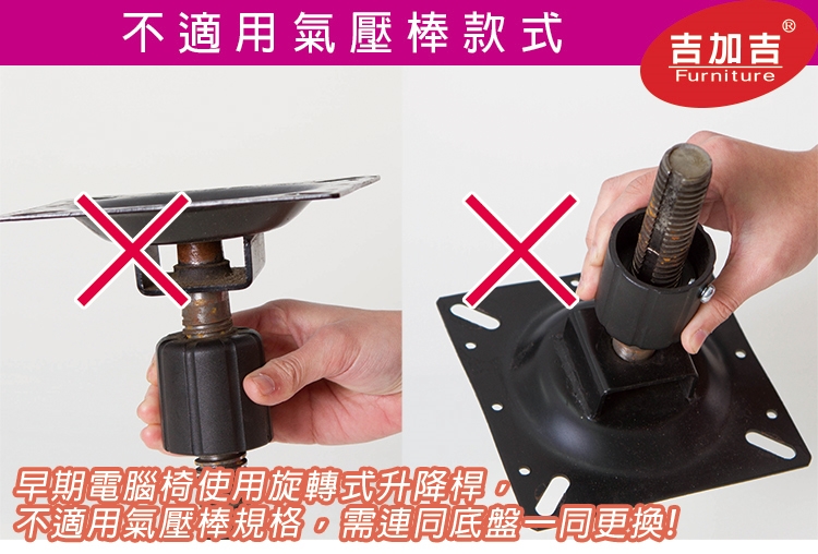 平面腳座的電腦椅,如要使用【縮管型】氣壓棒,要注意縮管的尺寸, 如縮管5CM、縮管7CM的氣壓棒,安裝後可能會露出尾管太多,