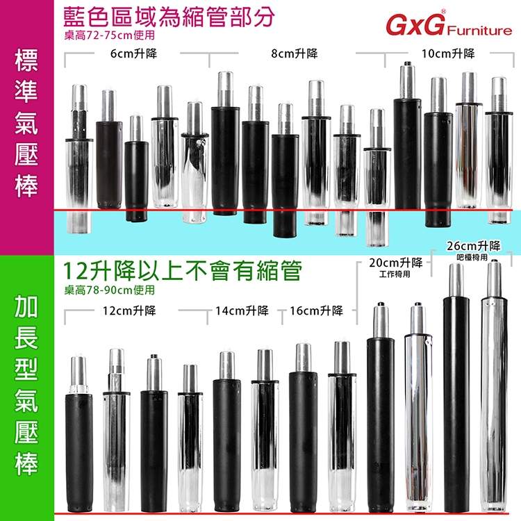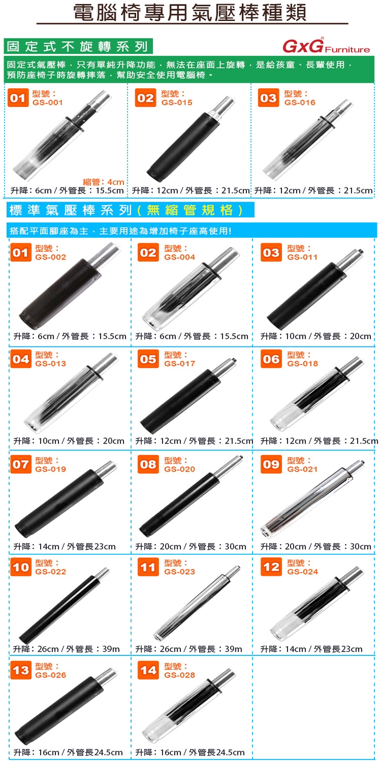 氣壓棒全尺寸圖對照,每款CM升降單位非氣壓棒總長,