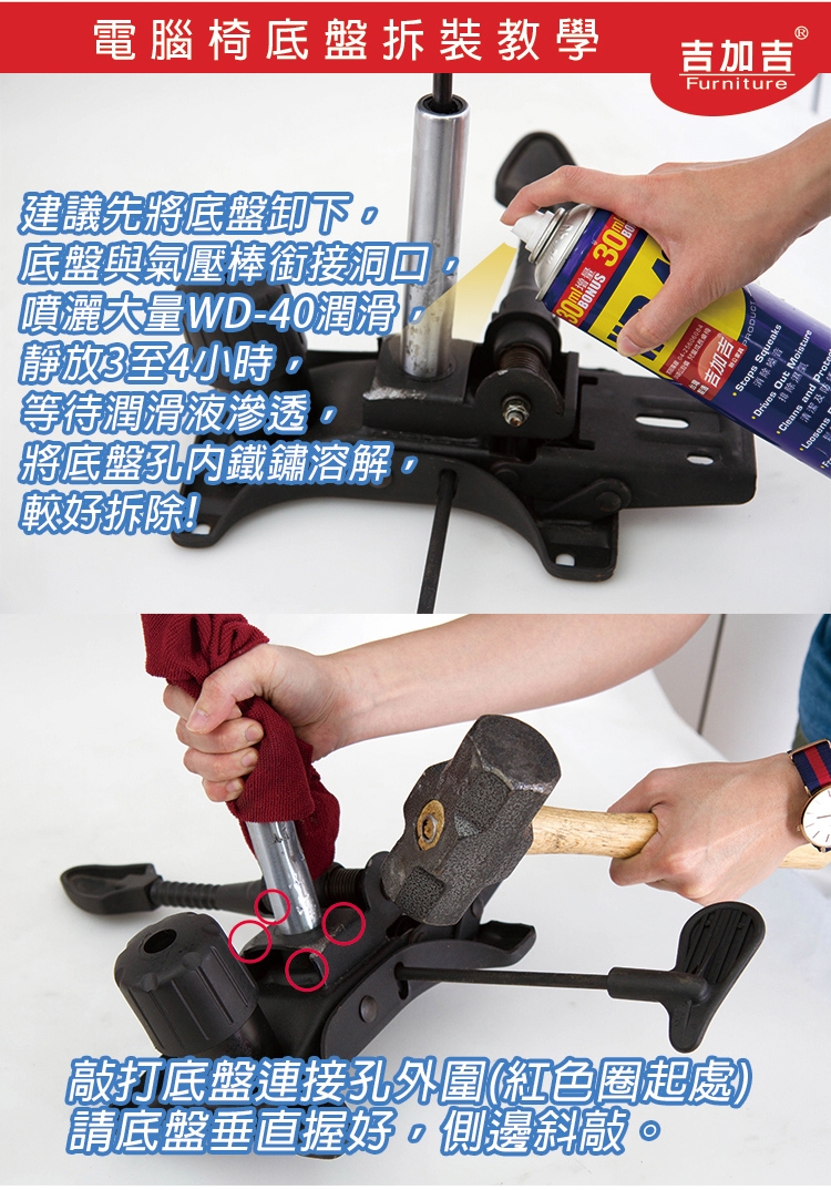 拆解氣壓棒,請敲打氣壓棒底部外圈,紅色圈起處,請勿敲打正中心,會打到氣閥,會使氣壓棒故障!