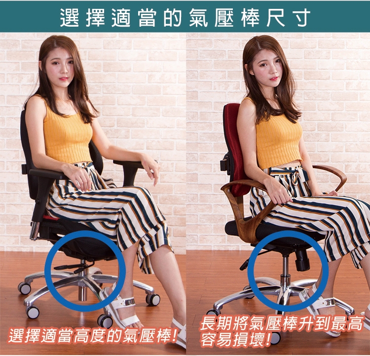 選擇適當的氣壓棒,避免椅子座墊,過矮或過高,如有疑問,可先詢問賣場人員。