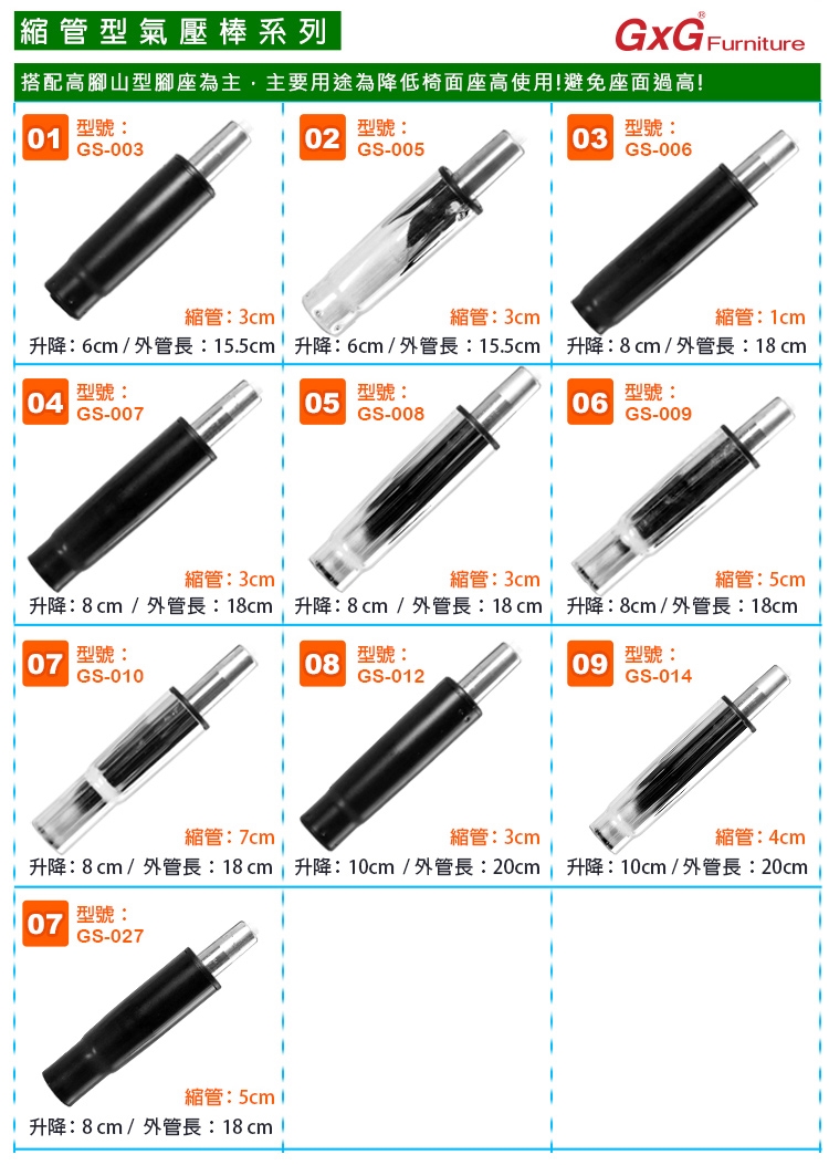 『縮管氣壓棒』屬是較高階的電腦椅使用,進口或外銷規格,多為搭配高腳型腳座,可以查看電腦椅腳座,