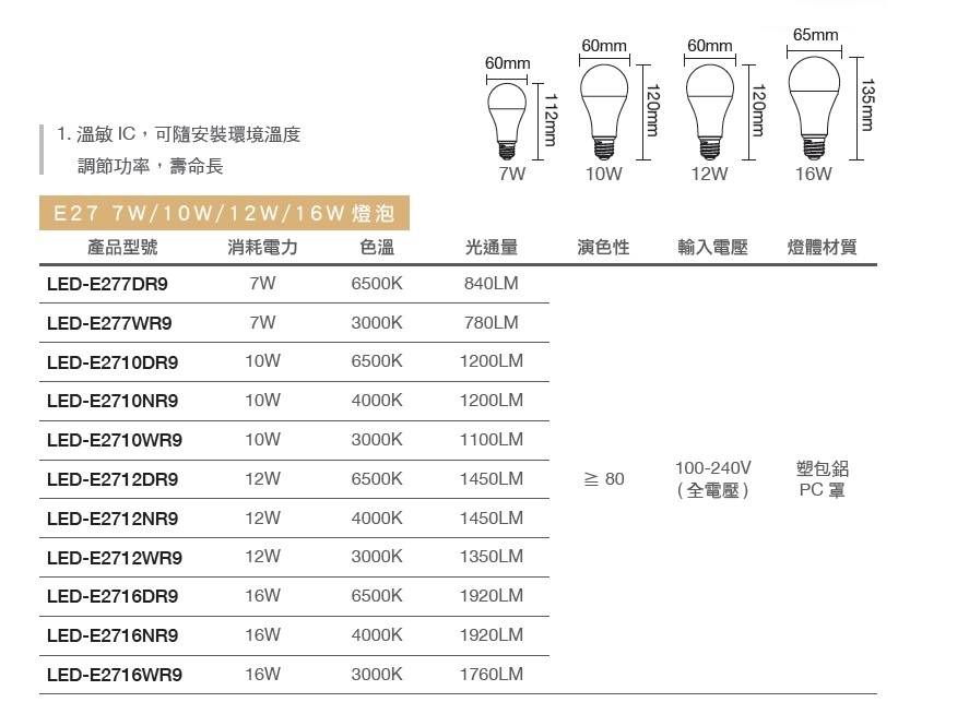 產品型號:LED-E2712DR9 / LED-E2712NR9 / LED-E2712WR9