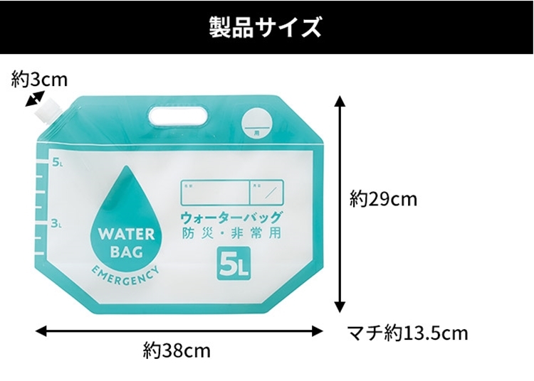 5L儲水袋 : 瓶口直徑3公分;袋體長38公分、高度(含提把)29公分、底部寬度(撐開後)約13.5公分