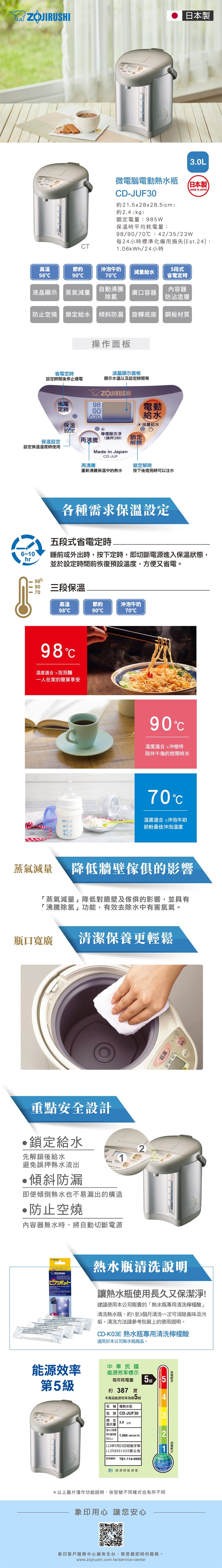 (2) 可自由設定3段式定溫70.90.98℃。(70℃泡牛奶.90℃省電.98℃泡麵)