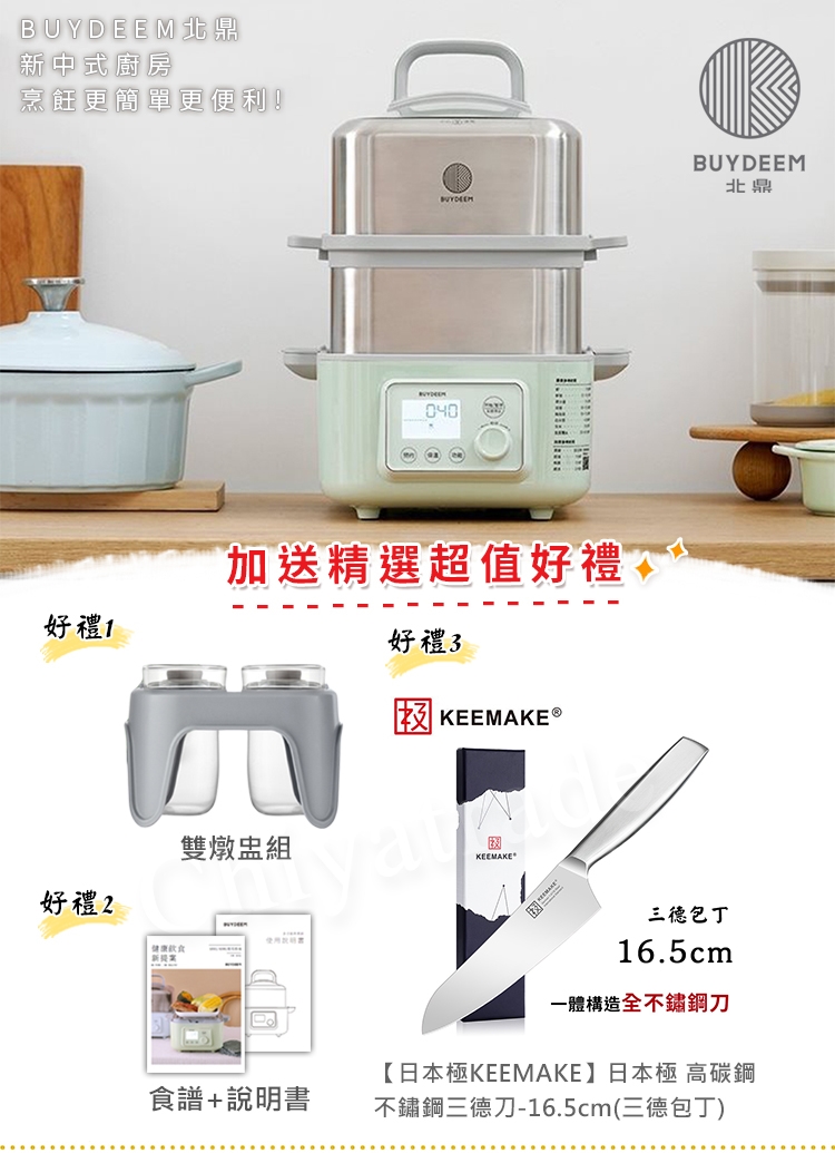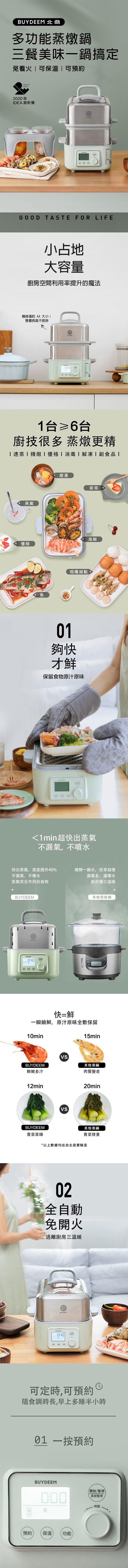 BUYDEEM 北鼎為忙碌的現代人設計了一款“省時、方便、全自動”的多功能蒸燉鍋。不論蒸、燉、做優格或副食品,1 台抵6 台,多種料理一次搞定!