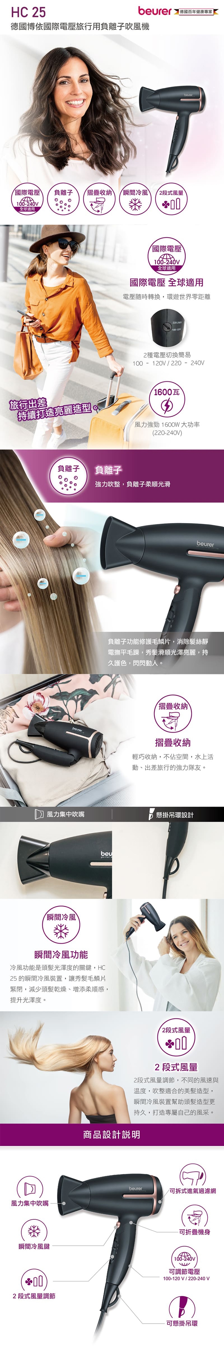 1600W(220V-240)強大風力,出國使用也能像在家一樣輕鬆吹整秀髮。負離子功能強力修護毛鱗片,能消除髮絲靜電,讓秀髮光澤亮麗,持久護色,閃閃動人,滑順不毛躁。