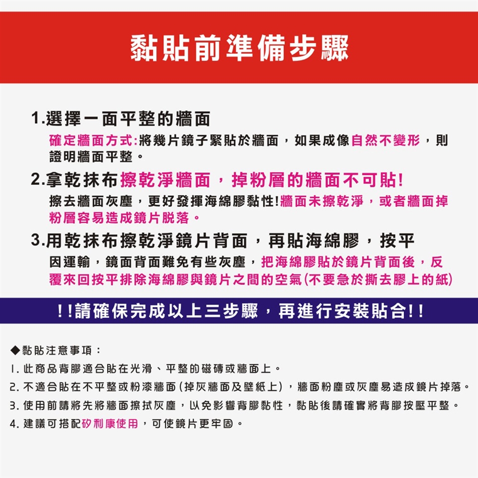 ◎建議可搭配海綿或免釘膠或是矽利康加強使用,可使鏡面更牢固!