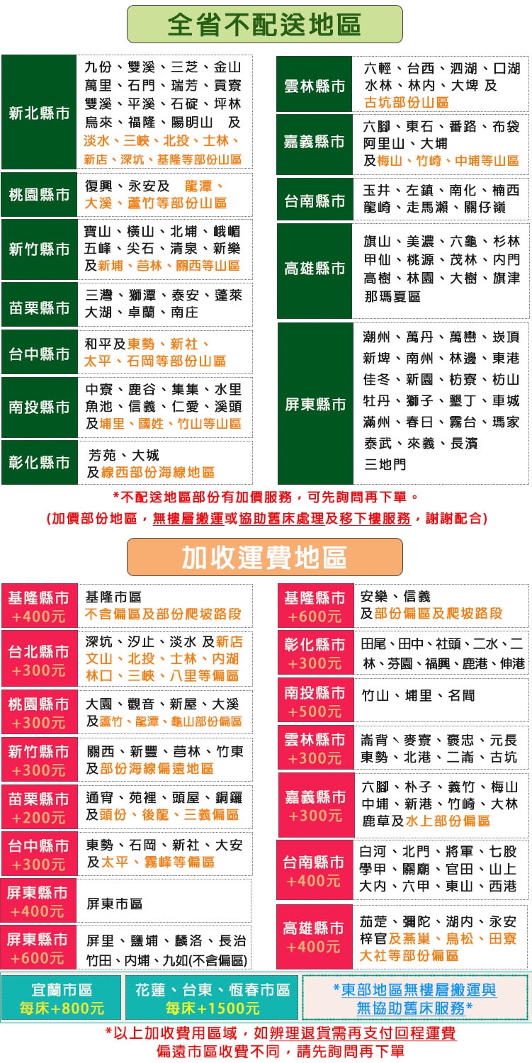 ◎宜蘭、花蓮、台東、恆春及偏遠等地區若無專車專人服務,故地區較偏遠者每床需補貼運費(請看附表),謝謝!! (無專車專人配送地區將無法搬運樓層及舊床回收)