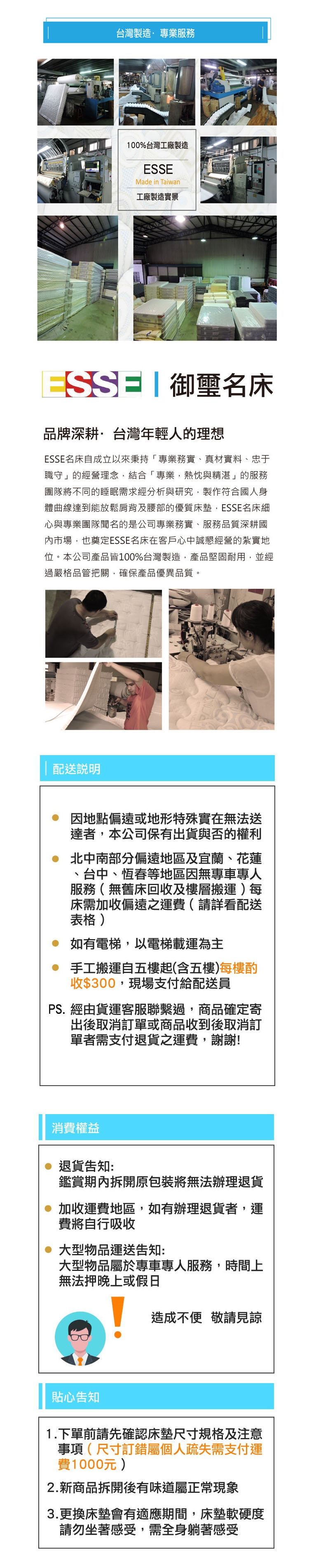◎手工搬運自五樓起(含五樓)(如家中有樓中樓需按樓層計算),每樓酌收300元,現場支付給配送員 (注意說明:手工搬運的過程因床墊屬大型商品,上下樓梯及樓梯狹窄或每層樓的轉角部份都無法完全掌握,送貨當天請清空容易損壞的東西,樓梯狹窄搬運有困難將會與客人填寫協議書確保送貨過程引起不必要的爭議,謝謝!!)