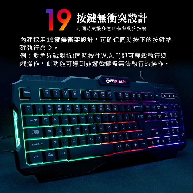 19鍵無衝突設計,針對多種遊戲必備按鍵同時點擊不卡鍵且不衝突,