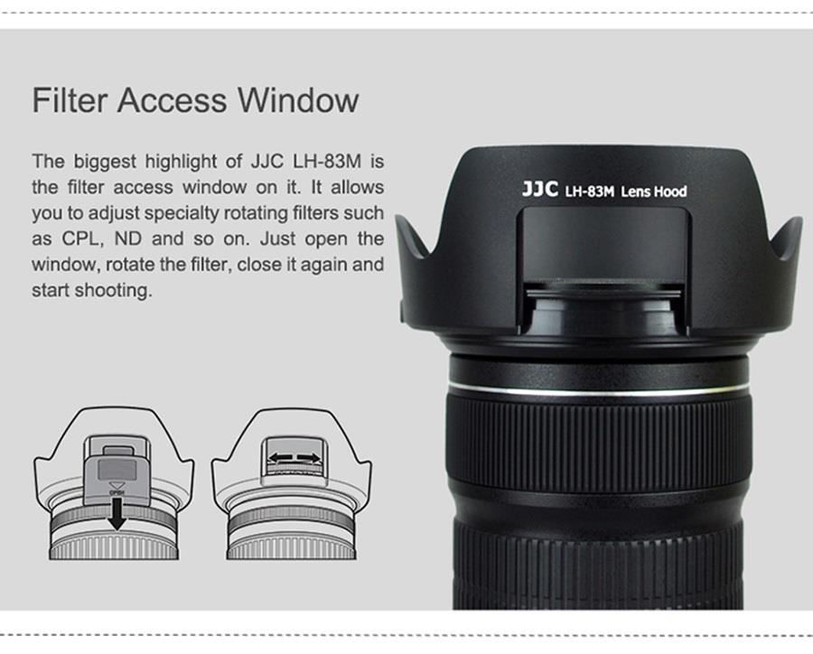 ●遮光罩體有"開窗",讓您使用CPL偏光鏡或可調式ND濾鏡/可調式星芒鏡時,可以更容易調整角度