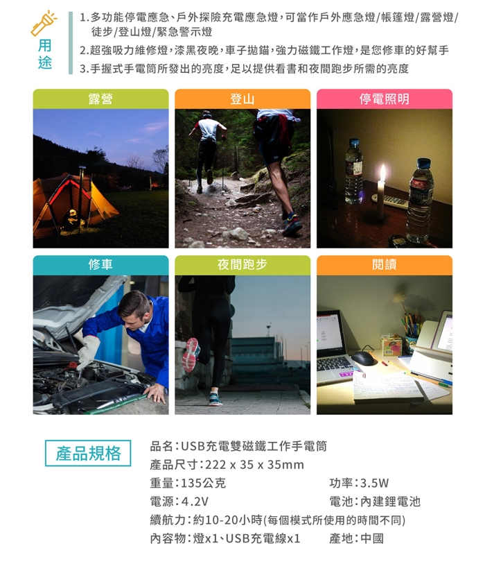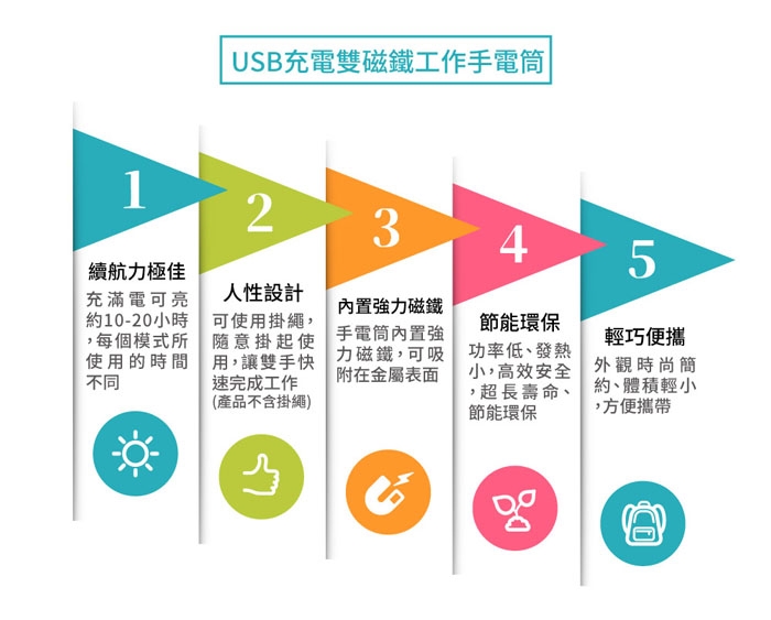 USB充電雙磁鐵工作手電筒 特色 :