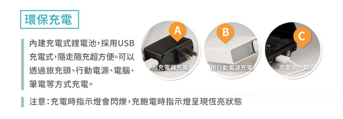 注意:充電時指示燈會閃爍,充飽電時指示燈呈現恆亮狀態