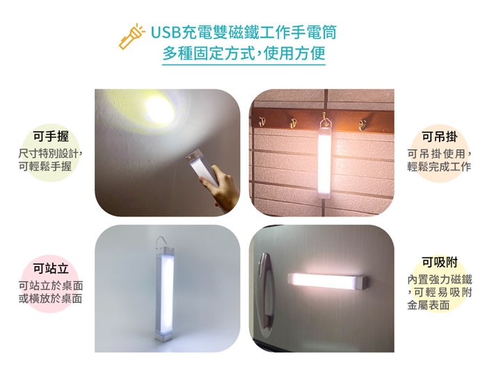 多功能強力磁鐵USB充電手電筒,多種固定方式,使用方便