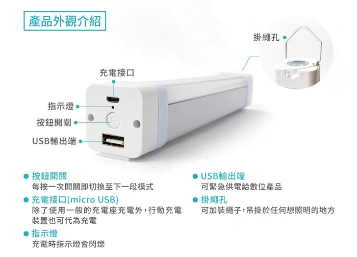 5. 掛繩孔 : 可加裝繩子,吊掛於任何想照明的地方