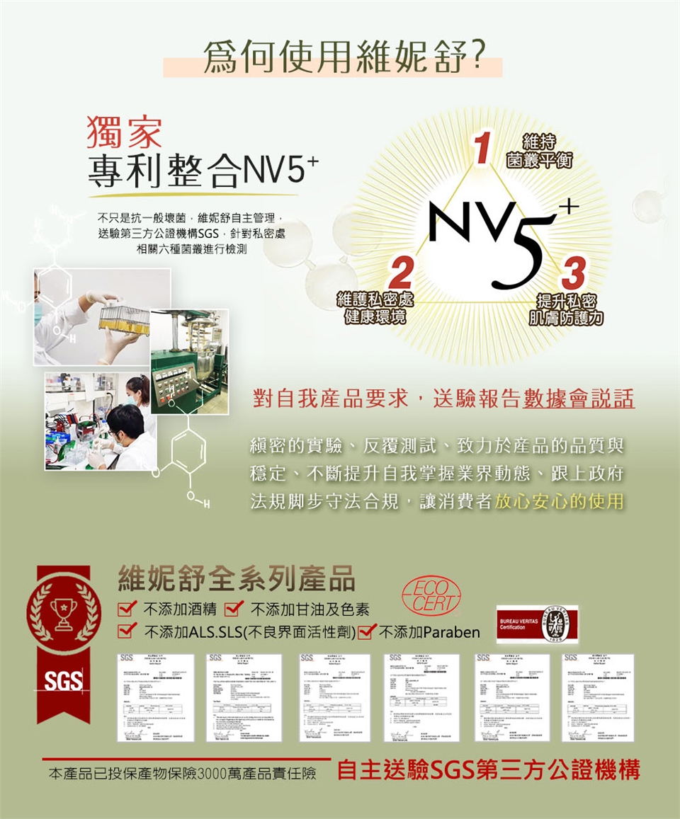 獨家整合成分NV5+ 通過SGS USP51 (私密肌常見菌叢)檢驗。