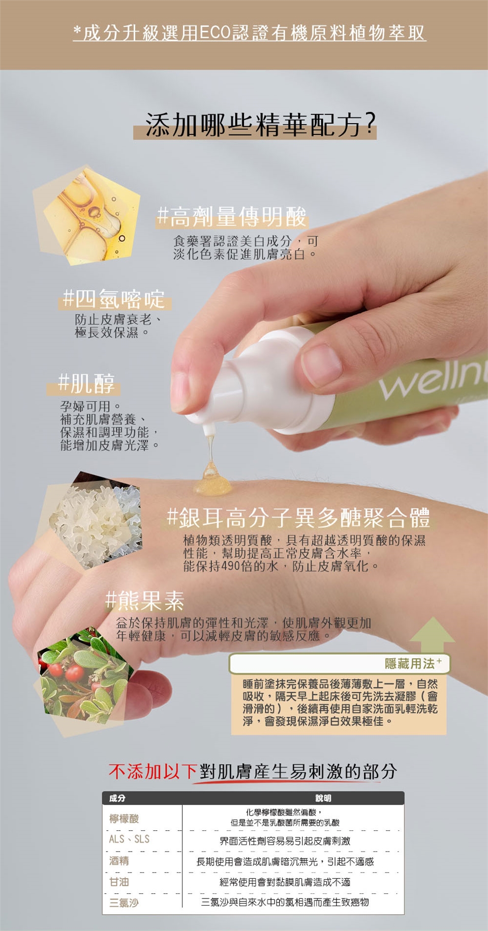 《因含有妝品級高含量傳明酸,建議先小範圍測試有沒有敏感問題。》