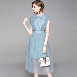 精品襯衫裙+蕾絲背帶網紗兩件式無袖洋裝-RN-girl