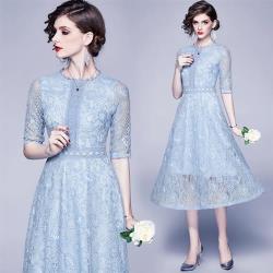 M2M-優雅動人花邊立領蕾絲拼接鏤空洋裝S-2XL