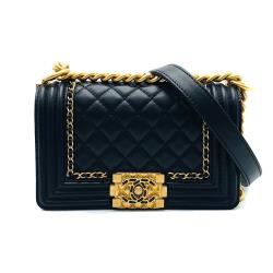 【CHANEL】19系列 BOY CHANEL 金雙C logo羊皮菱格金鏈肩背/斜背包-20cm(黑)