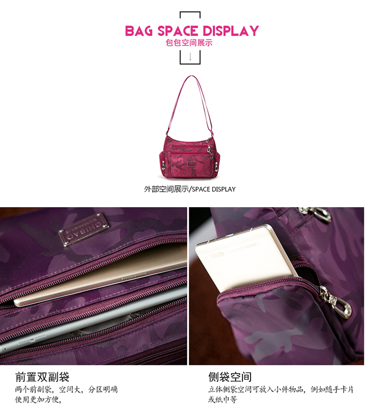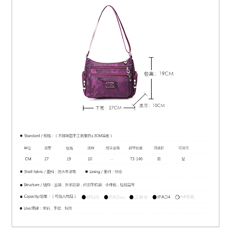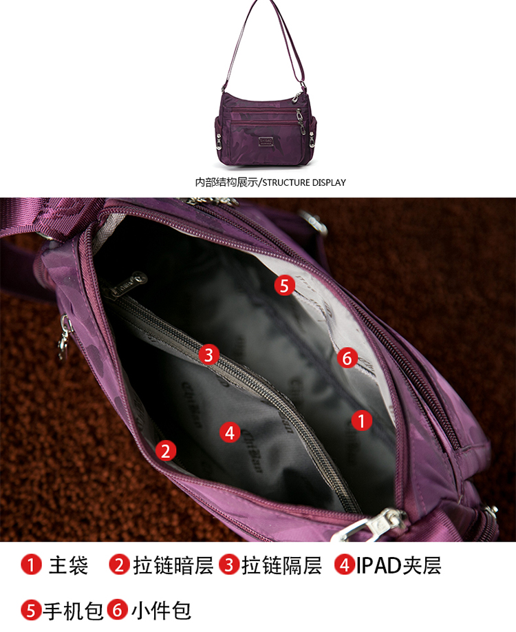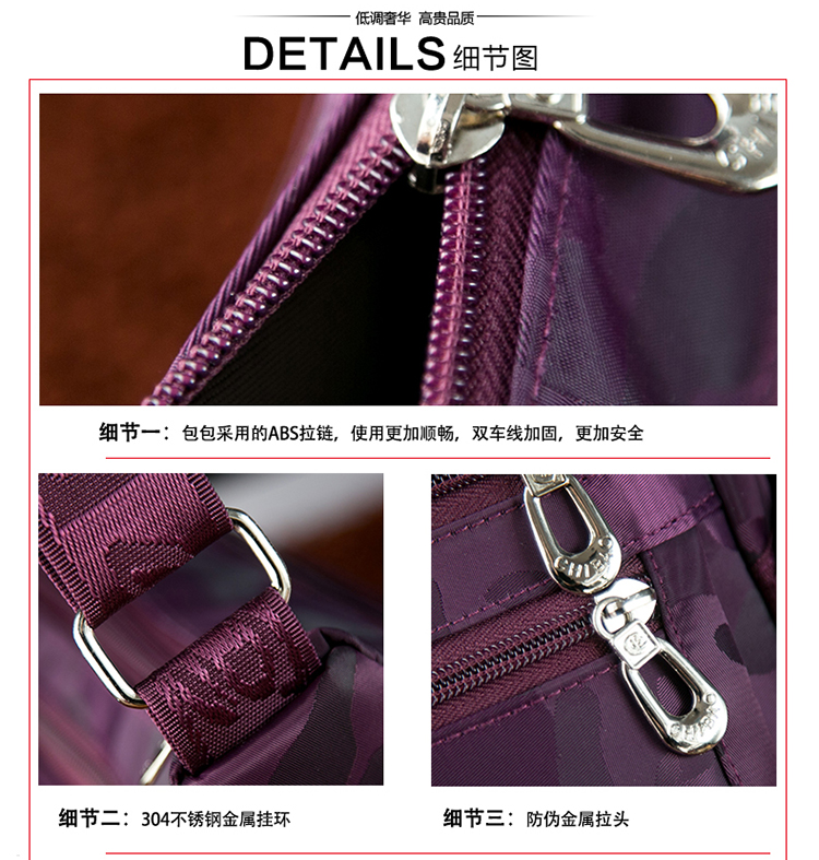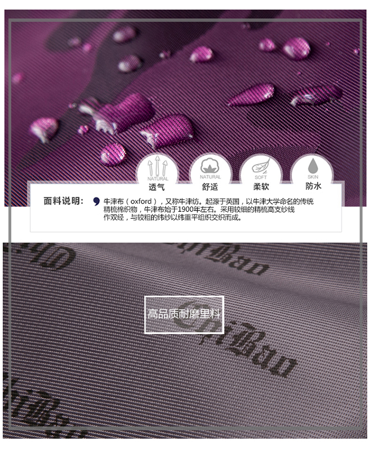 超值水洗牛津布尼龍布包 永遠水洗都不會褪色!送朋友或者是家人的最好禮物!溫馨提示:深紫色、紫色、 絢麗紫顏色相同,由于拍攝光線、角度、 顯示器的原因,略有色差,絢麗紫色更接近實物;包包兩側有拉頭,內兜有隔層。正品質量。