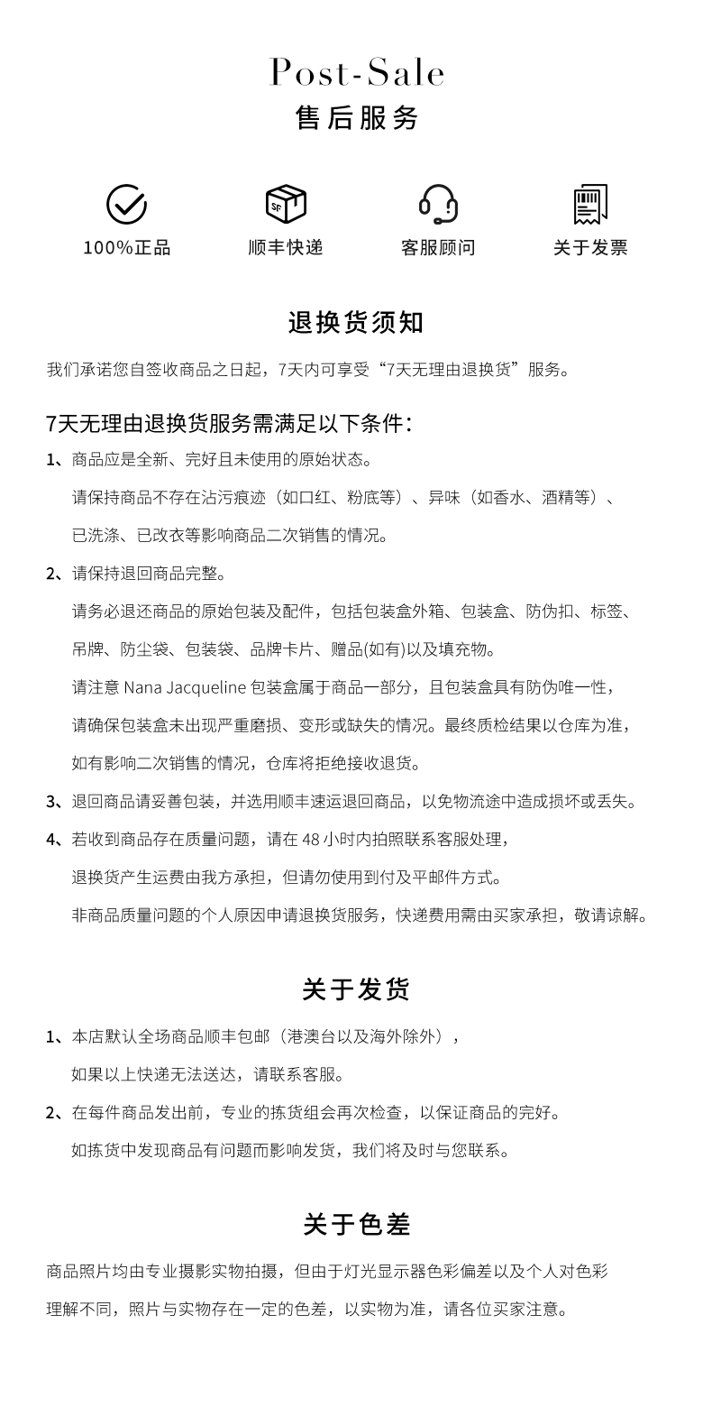 因商品為海外寄送,若拒收包裹,包裹將會退回海關並被銷毀,且訂單款項不會退款。請務必在下單前確認收件地址及商品內容無誤。