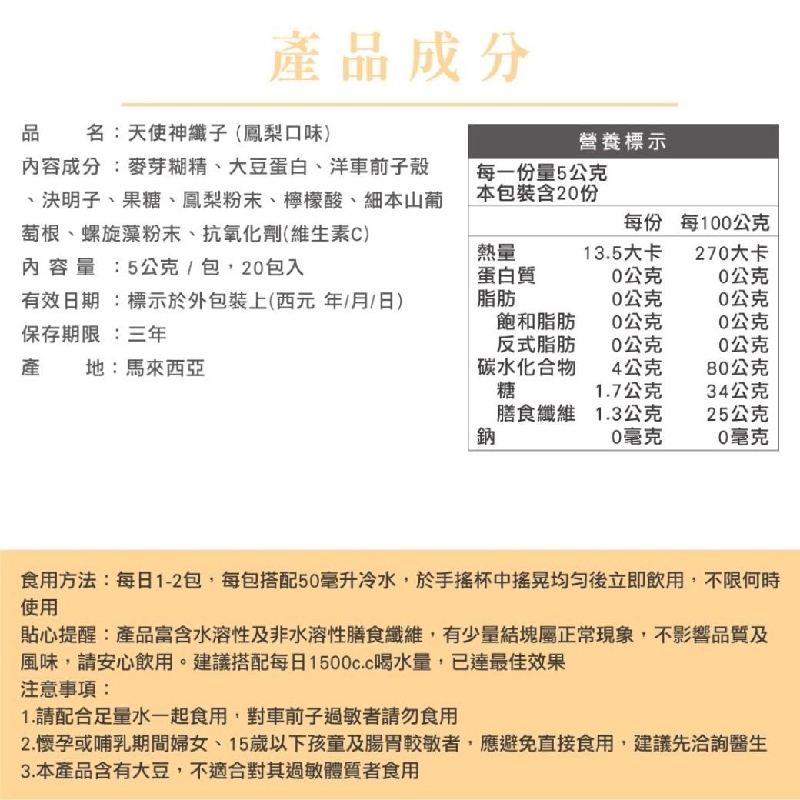 成分:麥芽糊精、大豆蛋白、洋車前子殼、決明子、果糖、鳳梨粉末、檸檬酸、細本山葡萄根、螺旋藻粉末、抗氧化劑(維生素C)