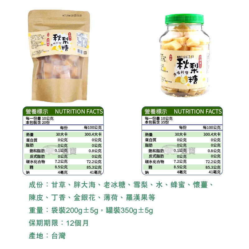 成份:甘草、胖大海、老冰糖、雪梨、水、蜂蜜、懷薑、陳皮、丁香、金銀花、薄荷、羅漢果等