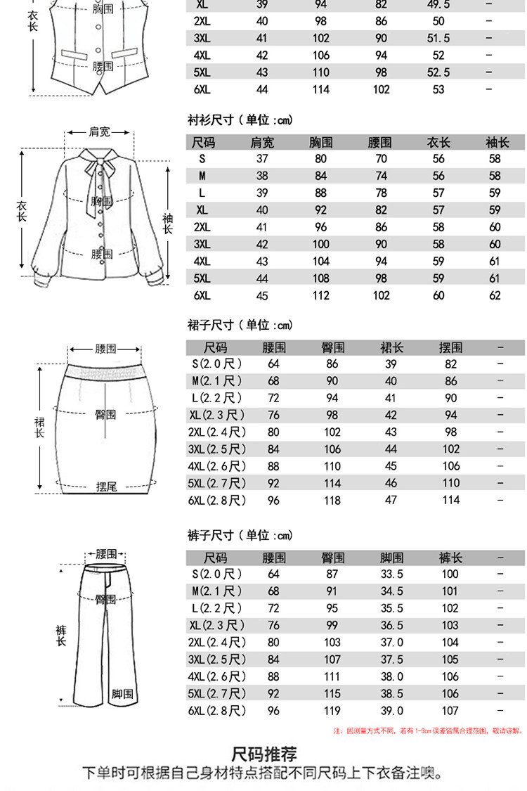 【1】修身版偏小,建議選平時大一碼或咨詢客服。【2】配飾,絲巾,腰帶,領結,領帶,胸徽,帽子,不隨服裝一起出售,如需要聯系客服。【3】免燙抗皺易打理,團購優惠,但是只換不退!【4】推薦尺碼供參考,不作為免費退換貨理由。【5】有單件有套裝可以根據需要選擇。