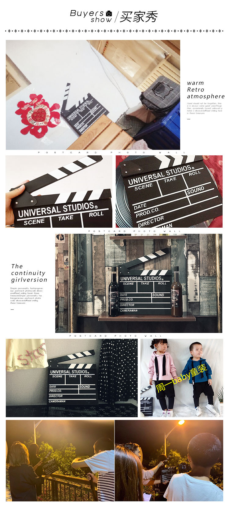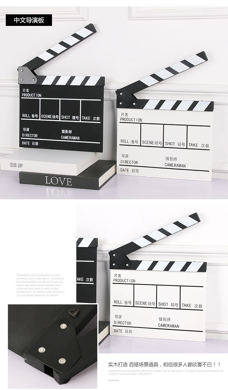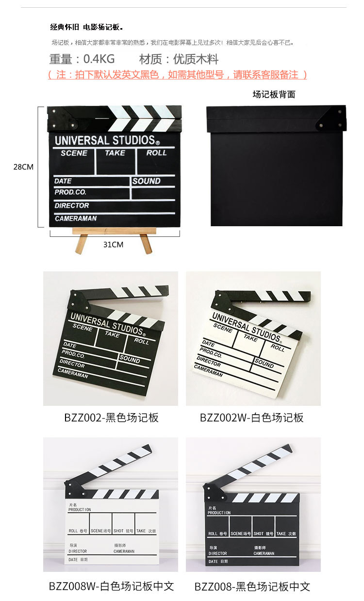 重要說明:導演板只能用粉筆書寫,寫完后就用布粘水擦干凈,千萬不能用記號筆(油性)寫會擦不掉,謹記。另外選款式以圖中的說明為準,不要看系統中出現的顏色。
