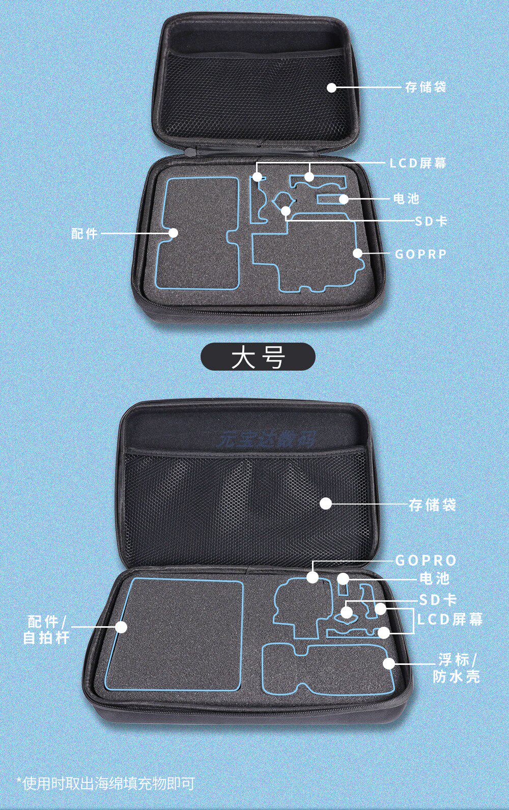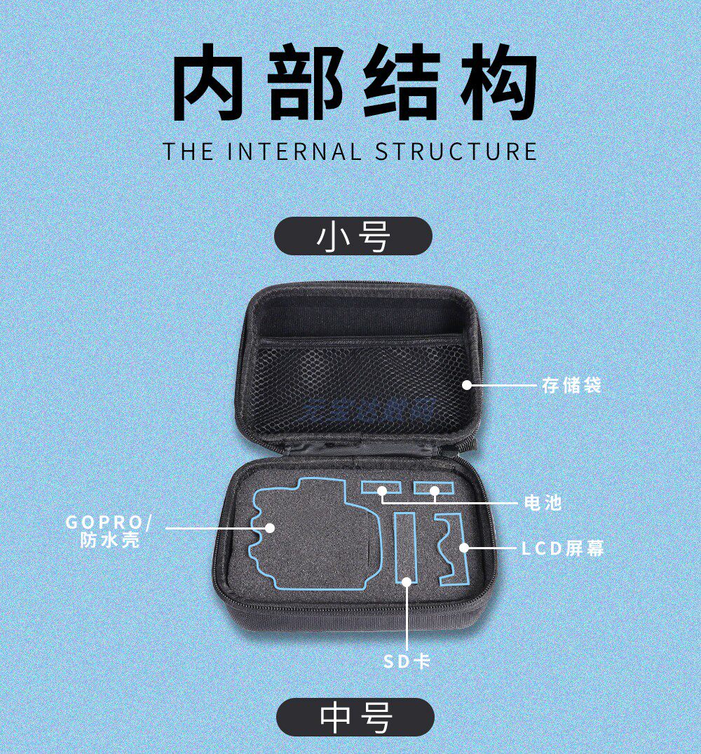 采用高檔針織布(尼龍)為面料,主料為硬度EVA,對您的GOPRO及GOPRO配件起到極強的防護作用。避免被劃傷等問題。