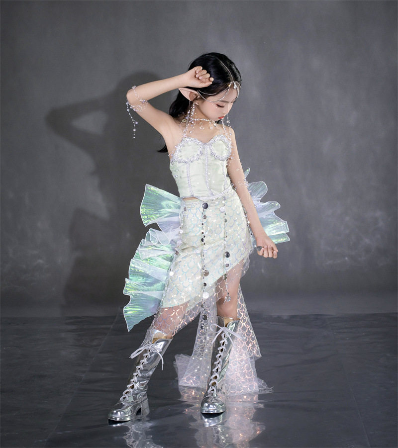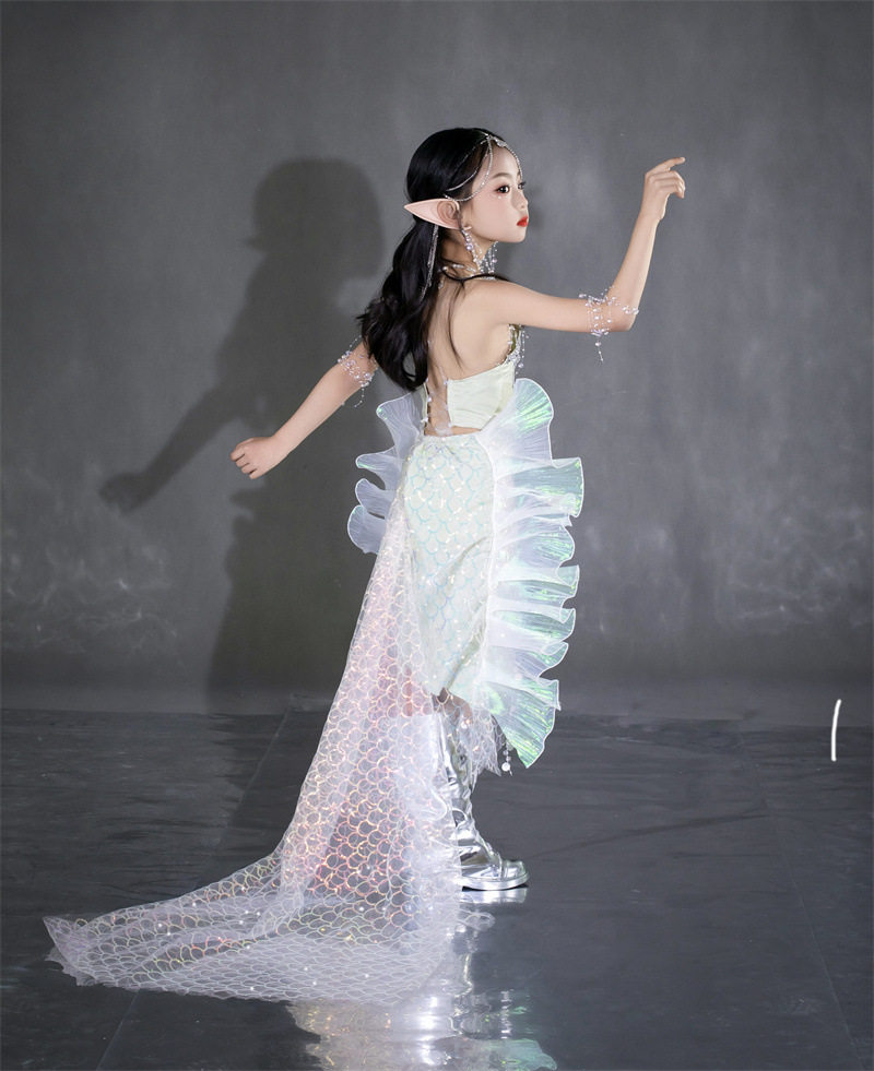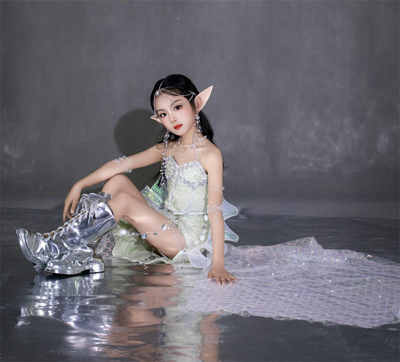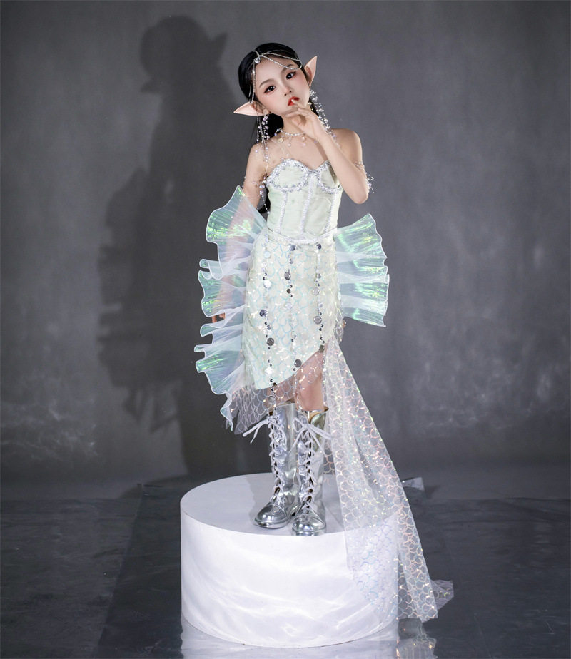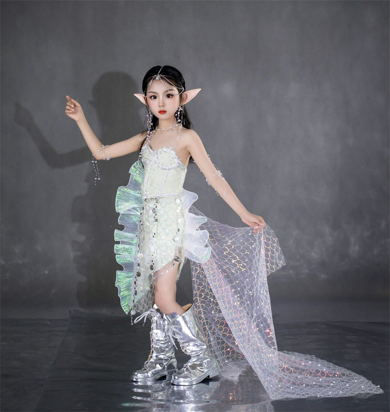 單品為人魚姬連體裙+精靈耳朵+流蘇耳夾+手鏈(1對)+額飾+水晶貝殼項鏈