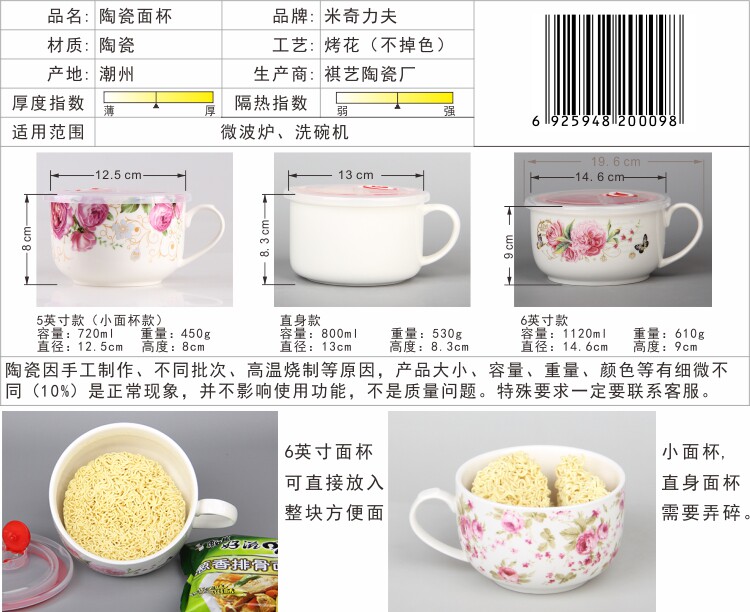 面杯是陶瓷材質,可以微波爐加熱,不能燒烤,運輸破損包賠,產品有3種款式,5英寸款,5.25英寸直身款和6英寸大面杯款,5英寸款和5.25英寸直身款面餅要弄碎,6英寸大面杯款可以放下整塊面餅,詳情前端有圖片參考。