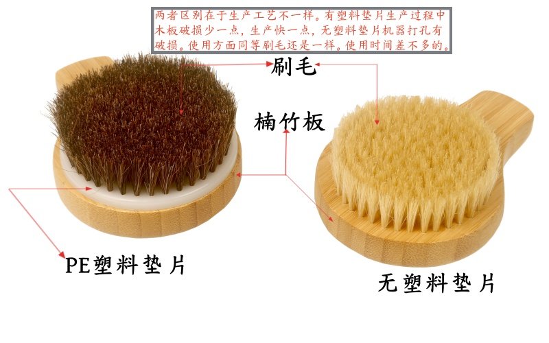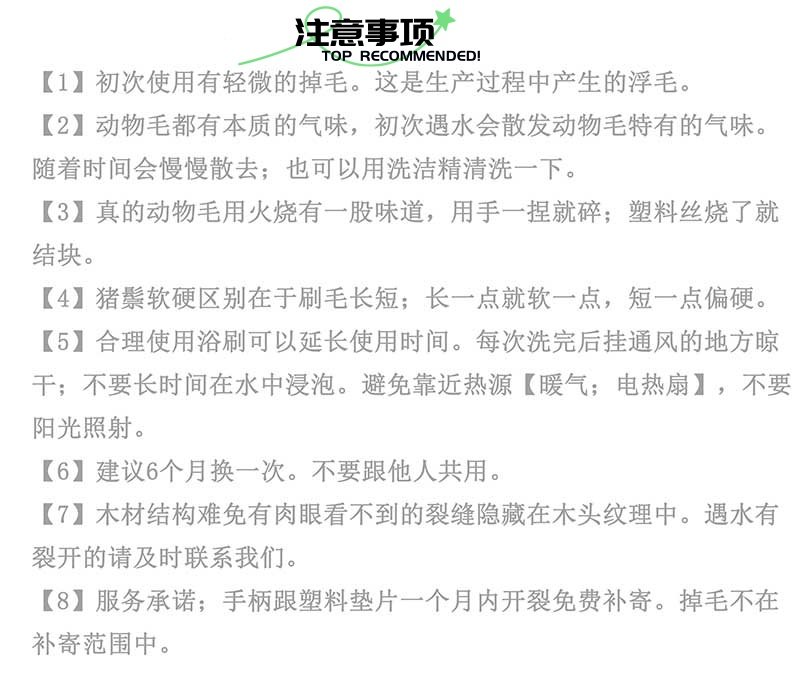 2. 天然豬鬃毛有一定的硬度是正常的,再軟的豬鬃毛也是有硬度,具體軟硬很難準確的區分,我們只能按我們多年生產和使用經驗加以區分,如果親拿到手感覺硬,不 要急著下結論,因為下溫熱水泡過后就會軟點下來,初次使用時,建議手法要輕