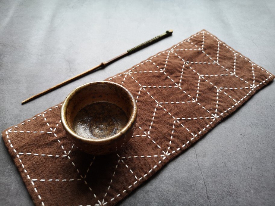 ---------------如意|柿染茶巾本店主打款,與同款的如意柿染茶席一套已經售出很多。樹形紋是日式刺子繡的傳統紋樣, 經典耐看。深色柿染布由于染的次數更多,加上做了刺子繡,所以較淺色柿染更硬些,為中和硬度,背布用了條紋老粗布,質感很協調。
