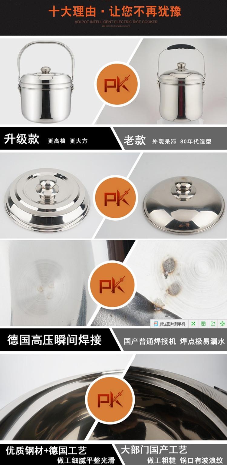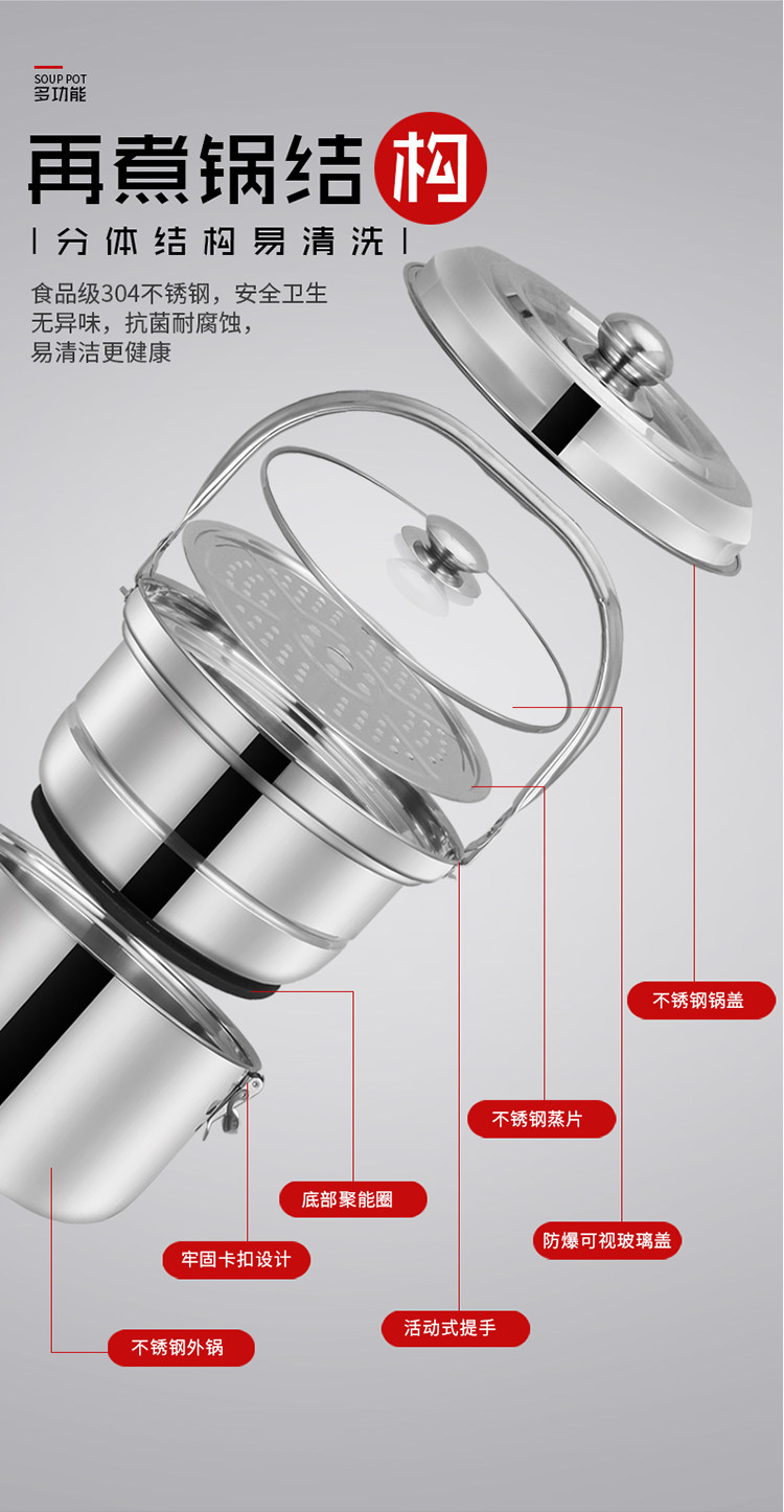 氣電兩用:適用于--1:明火(煤氣爐 -天然氣爐-煤球)2:電(電磁爐-電陶爐-電絲爐) 不是直接插電的哦! 采用德國工藝 加厚鋼材 內鍋為新款平底設計 簡潔不易糊底 聚能環采用瞬間高壓焊接 不脫落 不傷鍋底 鏡面拋光 容易清洗