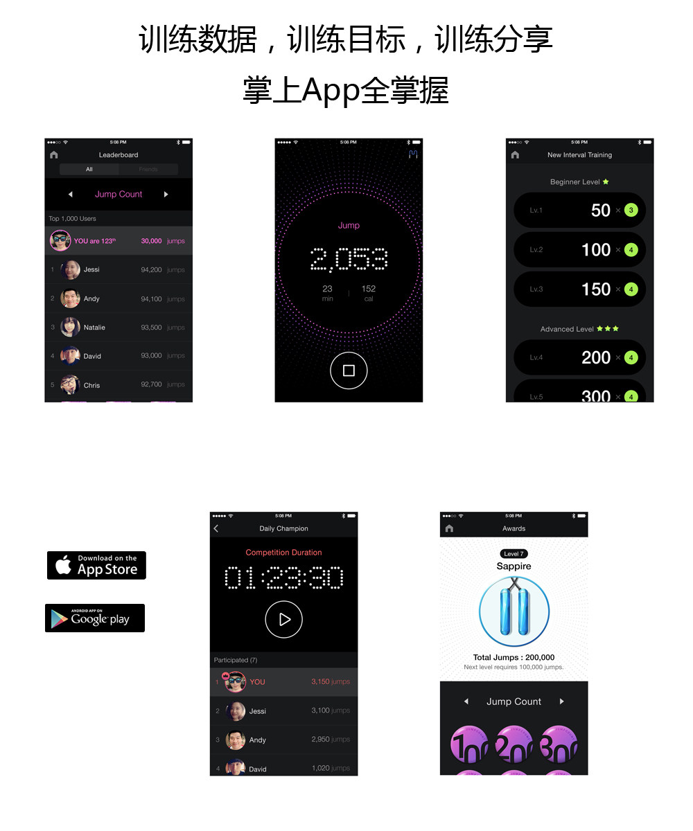 將 Smart Rope 與你的 iPhone、iPad 或 Apple Watch 上的 Smart Gym app 配對。它準確地記錄跳繩每次完整回環作為一次完整的跳躍,并能監測燃燒的卡路里和鍛煉時間。該 app 還可提供間隔訓練建議,通過解鎖獎勵和支持與朋友競賽來保持你的積極性。此外,你可以將它與 Apple HealthKit 同步,幫助你更好地了解自己的整體健康狀況。