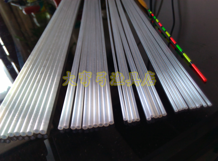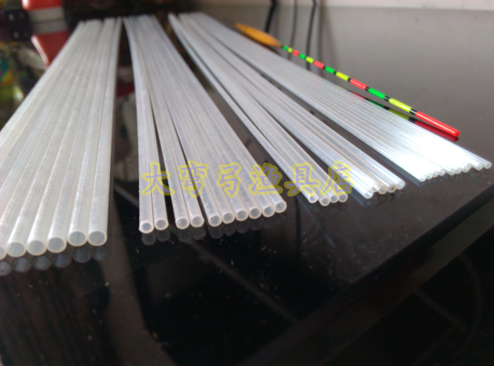 圓柱形直管,半透明,無錐度,沒有涂漂目顏色漆的,長度約45cm。您可以根據需要切成適當長度,涂好漂目漆用來做軟尾浮漂尾,或用于細尾浮漂加粗漂尾。合成塑料材質,材質較軟,可彎曲,不易折斷,是制作軟尾浮漂的材料。空心軟尾浮漂漂尾部分會有一些浮力,可有效過濾小雜魚鬧漂雜信號,特別適合小雜魚多的環境使用。