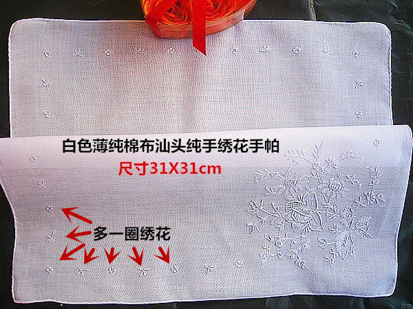 出口歐美日本的手工刺繡手帕。尺寸31X31CM。純手工抽紗刺繡,手工卷邊。面料白色薄軟純棉布100%Cotton.手帕有手工刺繡元素,能顯示出一定的品位與檔次。 清新獨特。歐洲.日本人對手工刺繡手帕有經久不變的使用習慣與追求。手帕也可蓋電話機,花瓶,包玉器,首飾,擦貴重物品,擦眼鏡等,因此它已經不只有擦汗的功能哦。原產地發貨。標的價格是一個的價錢