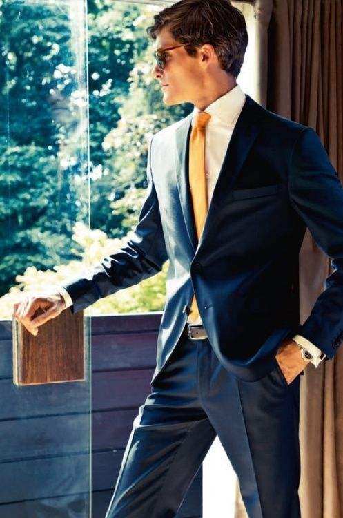 藏青色西服,配藍、胭脂紅和橙黃色領帶,穿白色和明亮藍色襯衫