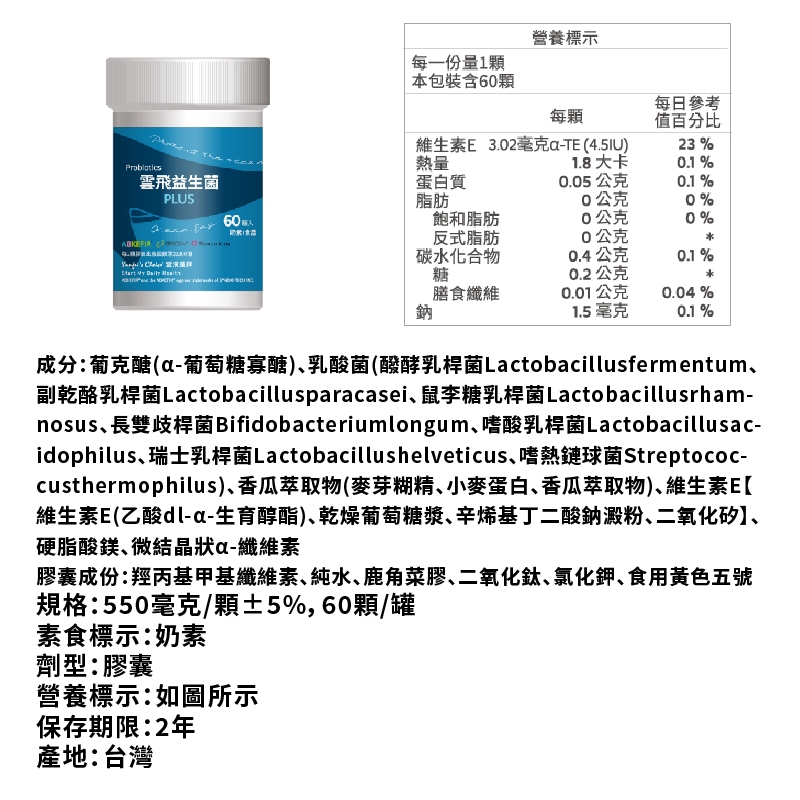 成分:葡克醣(α-葡萄糖寡醣)、乳酸菌(醱酵乳桿菌Lactobacillusfermentum、副乾酪乳桿菌Lactobacillusparacasei、鼠李糖乳桿菌Lactobacillusrhamnosus、長雙歧桿菌Bifidobacteriumlongum、嗜酸乳桿菌Lactobacillusacidophilus、瑞士乳桿菌Lactobacillushelveticus、嗜熱鏈球菌Streptococcusthermophilus)、香瓜萃取物(麥芽糊精、小麥蛋白、香瓜萃取物)、維生素E【維生素E(乙酸dl-α-生育醇酯)、乾燥葡萄糖漿、辛烯基丁二酸鈉澱粉、二氧化矽】、硬脂酸鎂、微結晶狀α-纖維素