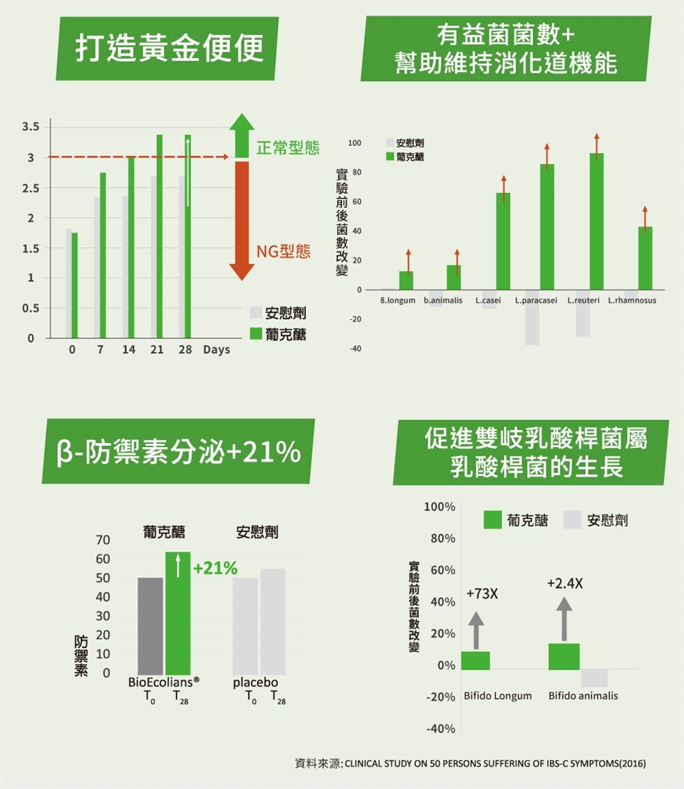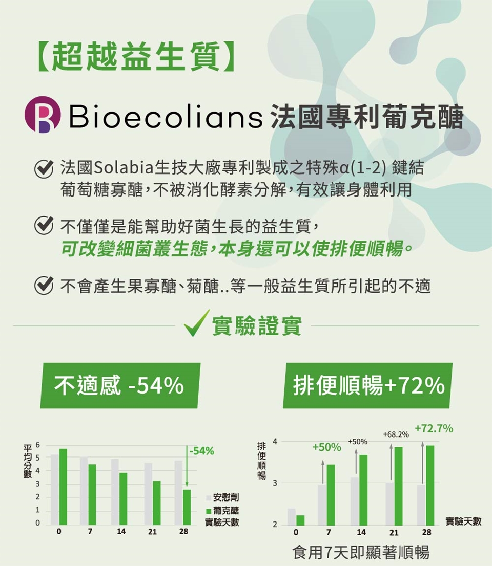 [健康維持]:BioEcolians法國專利葡克醣,為專利"益菌生",提供益生菌養份,進而幫助維持消化道機能。
