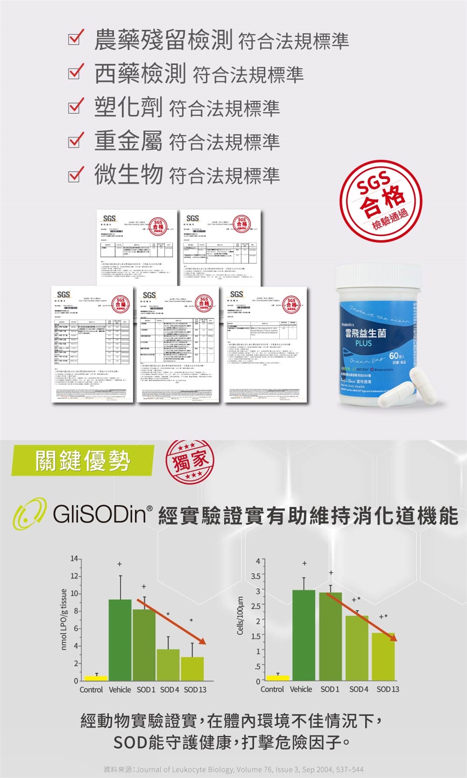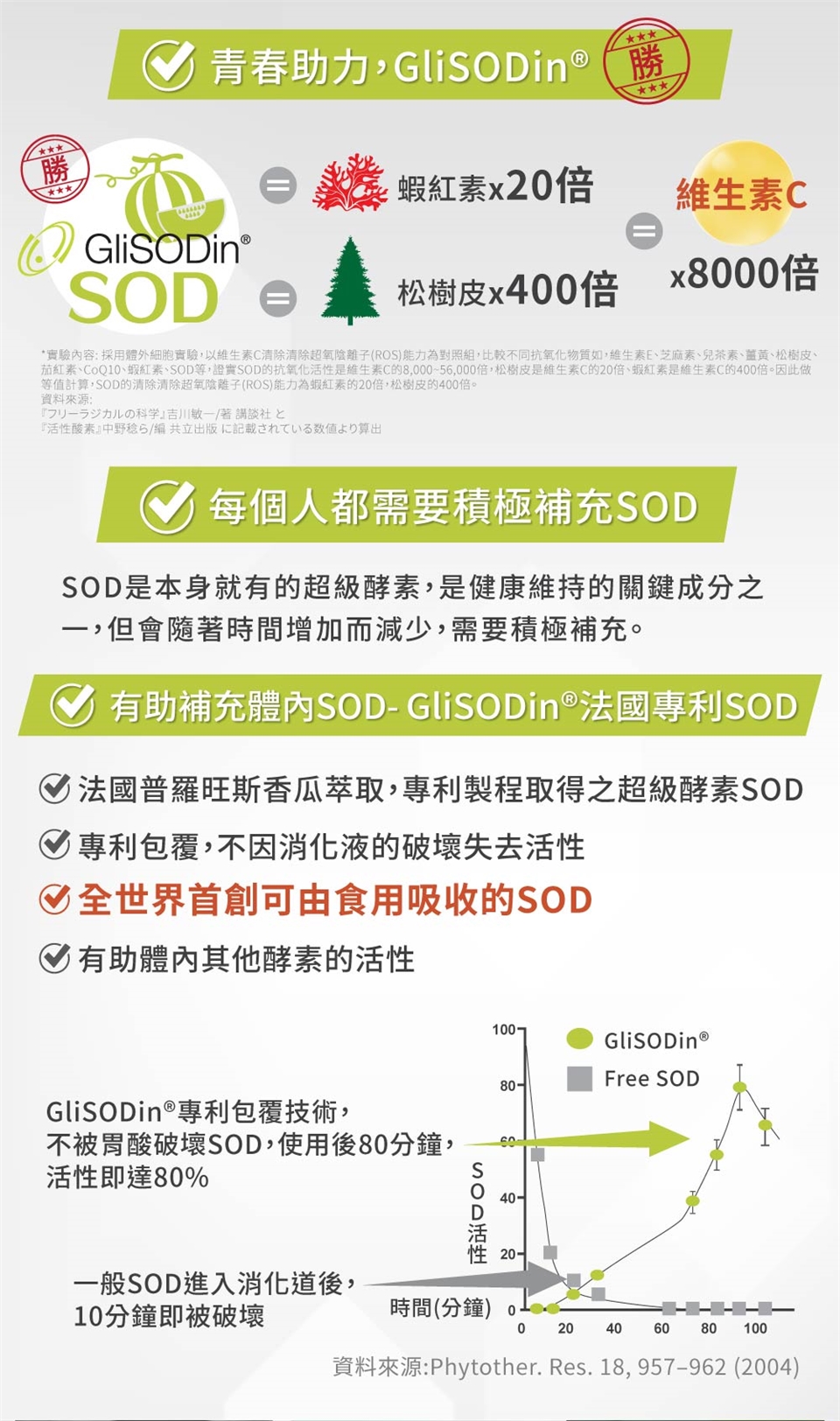 [營養補給]:GliSODin®法國專利香瓜萃取 SOD,選用法國南部普羅旺斯特殊品種香瓜,嚴格的栽植條件,SOD的含量是一般香瓜的7倍。是全世界首創經科學證實,可食用的SOD,專利包覆技術,使SOD能通過胃酸,吸收力佳;能協同關鍵成份,營養補給。