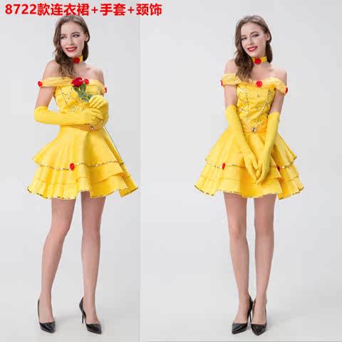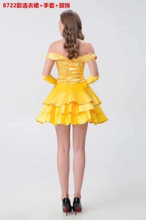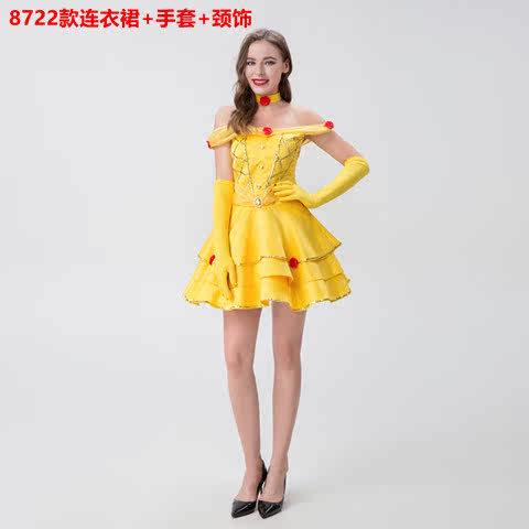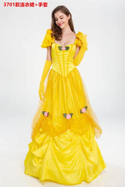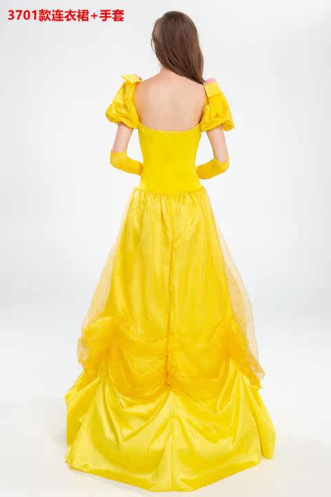 迪士尼經典動漫人物公主連衣裙寶貝包含:連衣裙 或連衣裙+手套(需要裙撐的可以選加裙撐的哦)寶貝顏色:藍色 黃色寶貝材質:聚酯纖維寶貝尺碼:S M L XL XXL