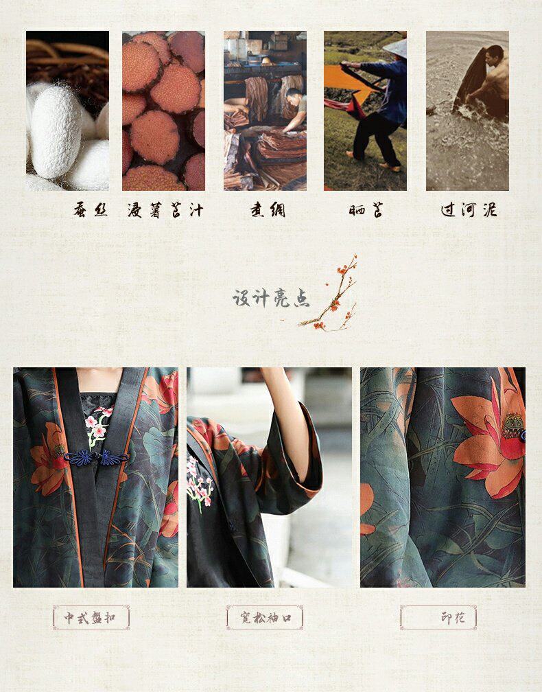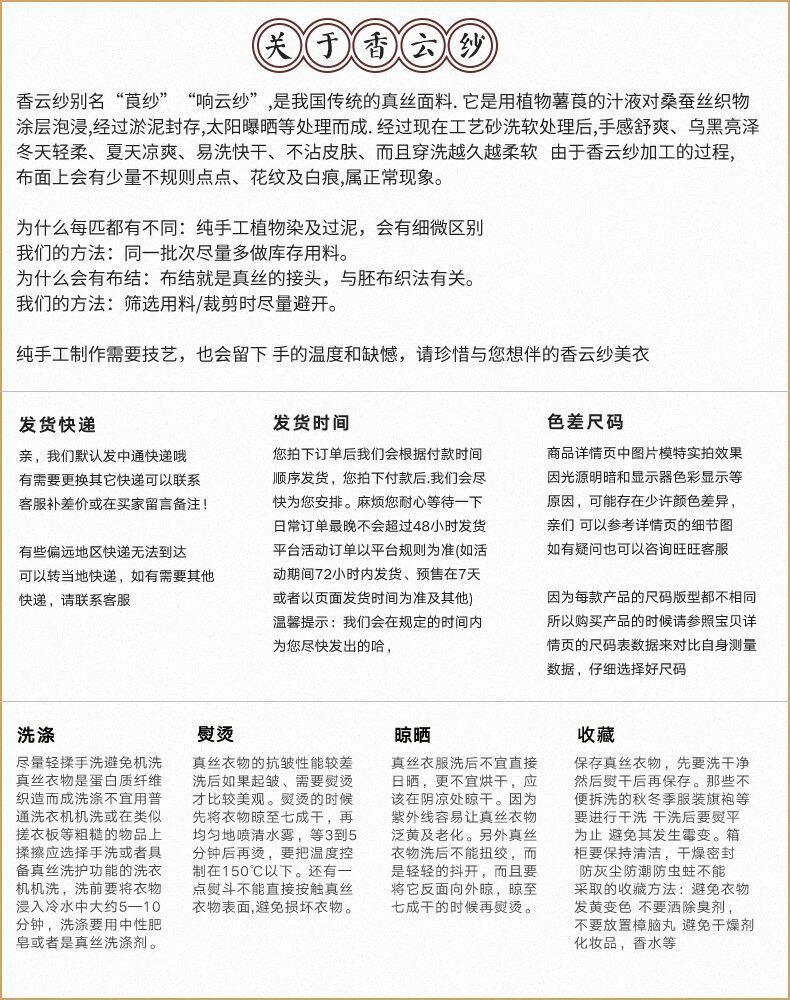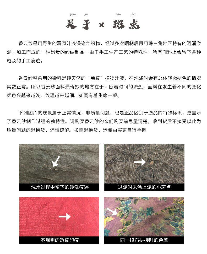 {"text":"此款为正宗广东产香云纱(温馨提示:现在市面上充诉着大量非正规工艺制作的香云纱,这种次质量的面料穿在身上有不透气、容易粘身等特点)正宗的香云纱只产自广东,它是天然植物薯莨的汁液对真丝涂层泡浸,淤泥封存,太阳曝晒而成,穿着自然清凉,由于制作特殊性,布面会有少量不规则斑点属正常现象"}