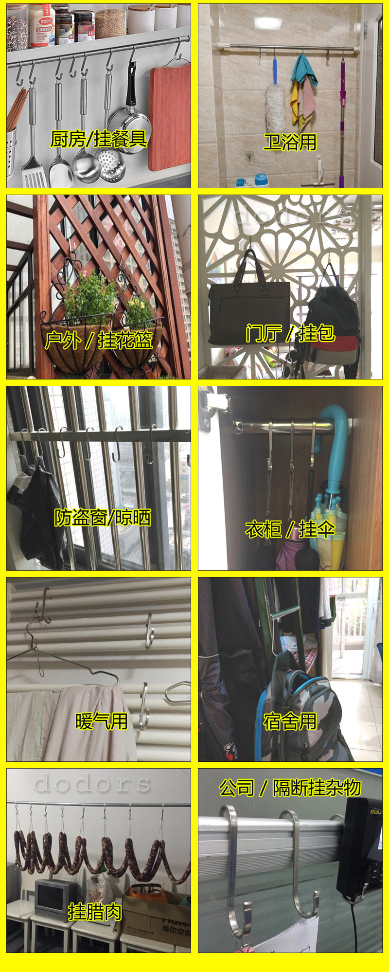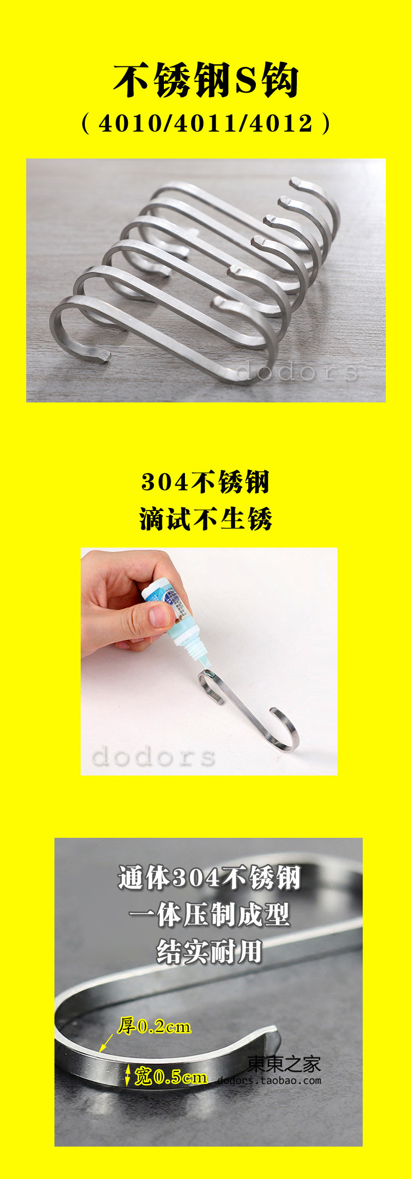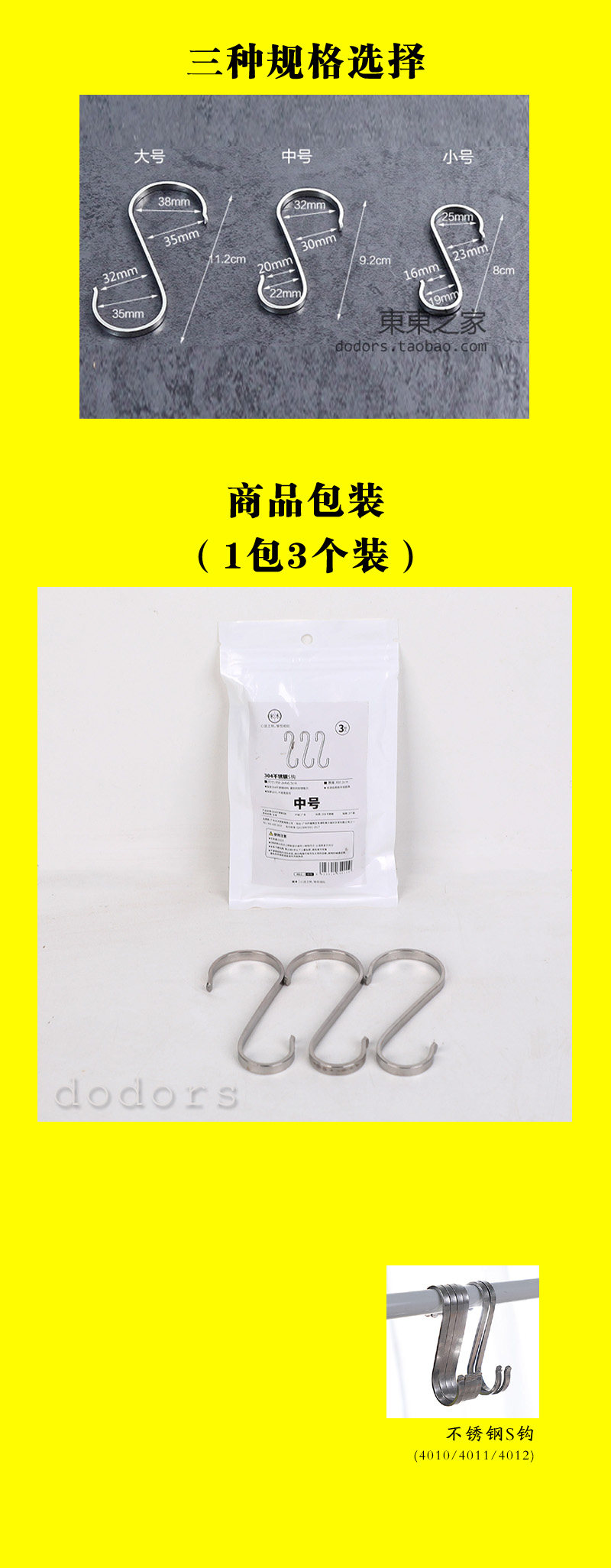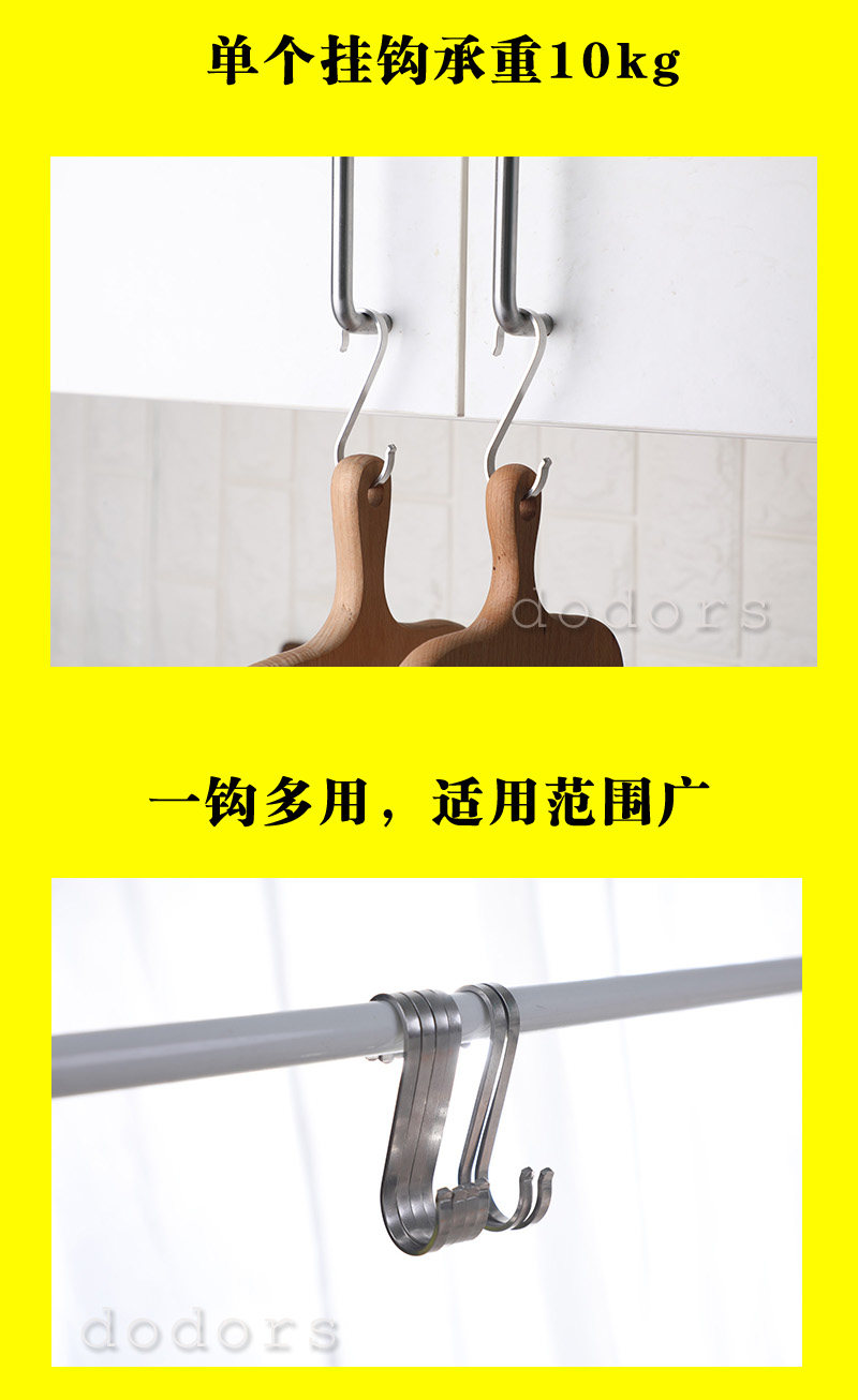 **************************************************【品名】304不銹鋼S鉤【品牌】米木【材質】304不銹鋼【規格】小號長度約8cm,中號長度約9.2cm,大號長度約11.2cm(S鉤鋼板厚度0.2cm,寬度0.5cm)【承重】承重10kg【包裝】OPP袋【適用范圍】小號適合直徑1.6~2.5cm橫桿,中號適合直徑2~3.2cm橫桿,大號適合直徑3.2~3.8cm橫桿【產品特點】優質304不銹鋼材質,不易生銹,款式簡約大方,適用范圍廣泛,尤其適合廚房使用,可以掛臘肉、也可以懸掛勺鏟、砧板等**************************************************